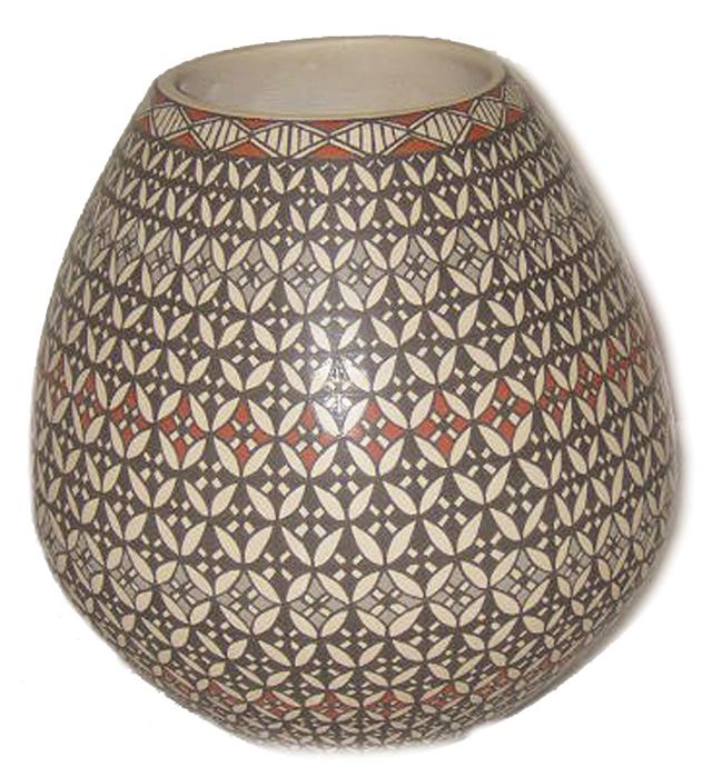 Circa 2009, Rosa Ledezma, Beautiful polychrome olla with overall banded designs. 6" x 6"