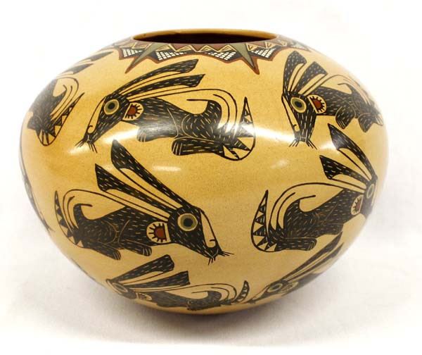 Mata Ortiz Pottery Rabbit Jar by noted Mata Ortiz potter Roberto Banuelos, measures 6'' x 8'' and is signed by the artist, FYI: ''Roberto has been creating ollas for about 20 years. His wife, Angela makes the pot and Roberto paints. Originally he preferred to make black pots, but now the couple works mainly with colored clays. Roberto is one of the first, if not the first, to use the rich red clay from the pass in the Sierra Madre on the way from Mata Ortiz to Agua Prieta.''