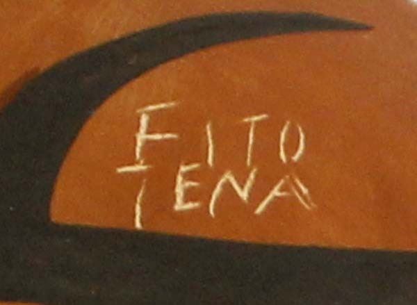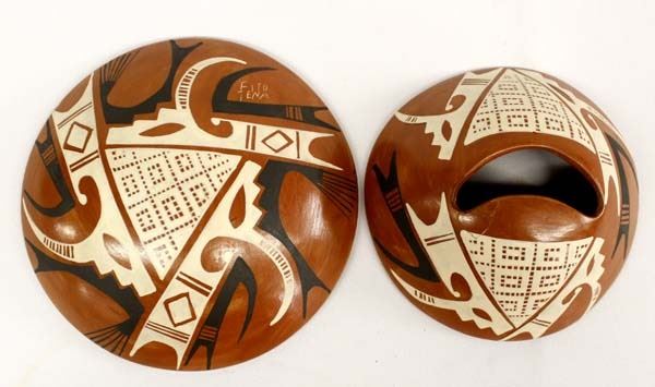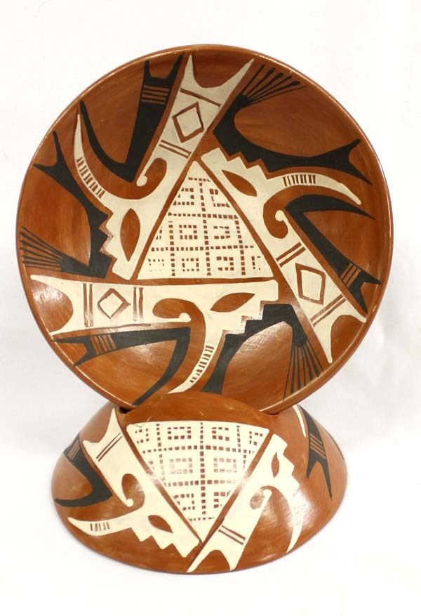 Mata Ortiz Polychrome Pottery Shallow Bowl & Stand by Fito Tena, bowl measures 7''D x 2''H and matching stand measures 2''H x 5.75'', signed on the bottom of bowl, the stand has been glued
