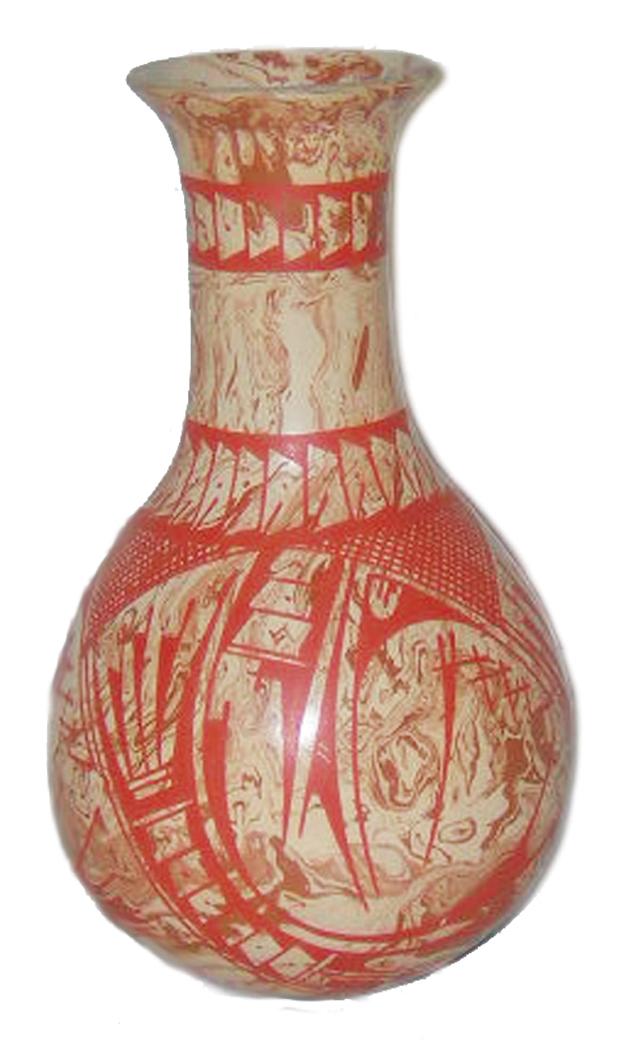 Circa 2009, Victor Reyes, Red-on-tan marbleized clay pottery vase with interesting curvilinear designs. 7" x 4"