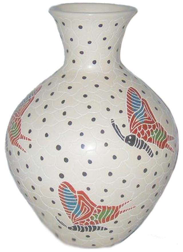 Circa 2009, Vidal Corona, Unique white slip vase with polychrome butterflies and dots all around. 7" x 5-1/2"