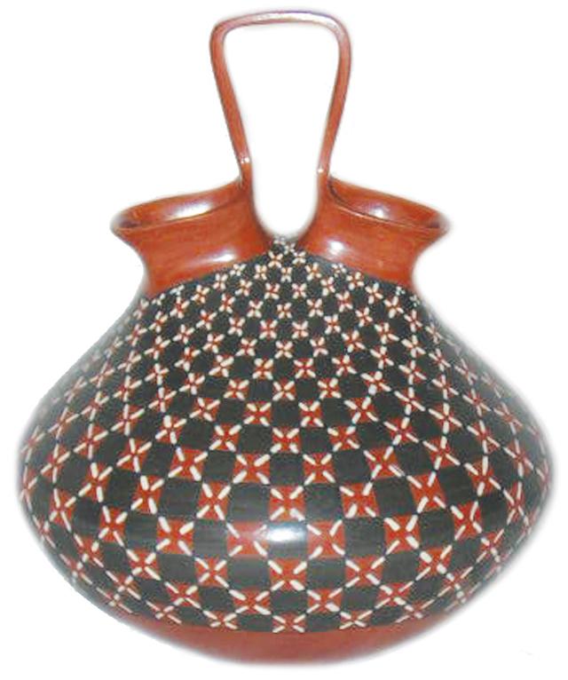Circa 2009, Elsa Ledezma & Jorge Ponce, Extra fine redware wedding vase with checkered black and white design on red slip. 6" x 5"