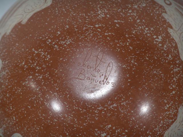 Circa 1993, Robert Banuelos, Outstanding handmade redware pot, hand painted with repeating rabbit design, by this master potter. 8" x 9"