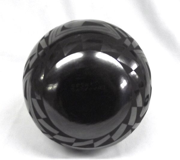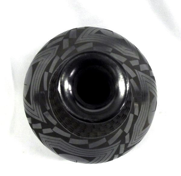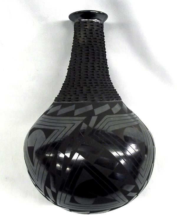 Mata Ortiz Pulled Spout Black on Black Olla by Cesar Sandoval, measures 9''H x 6.5''W, gun metal finish, highly textured pulled spout, bowl is decorated with geometric and abstract designs, very beautiful piece of Mata Ortiz