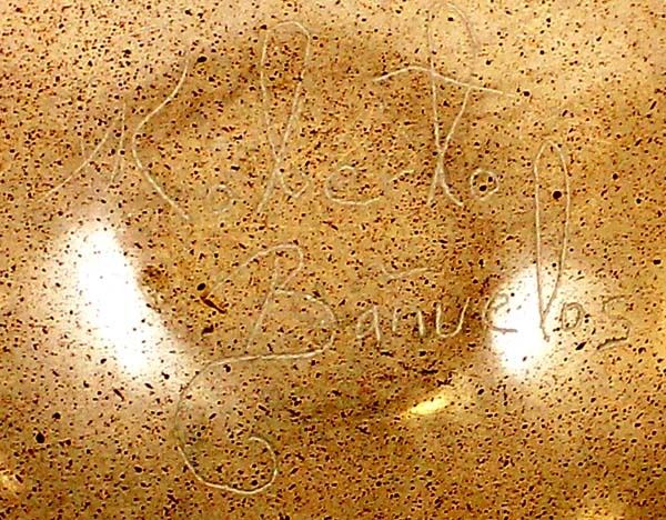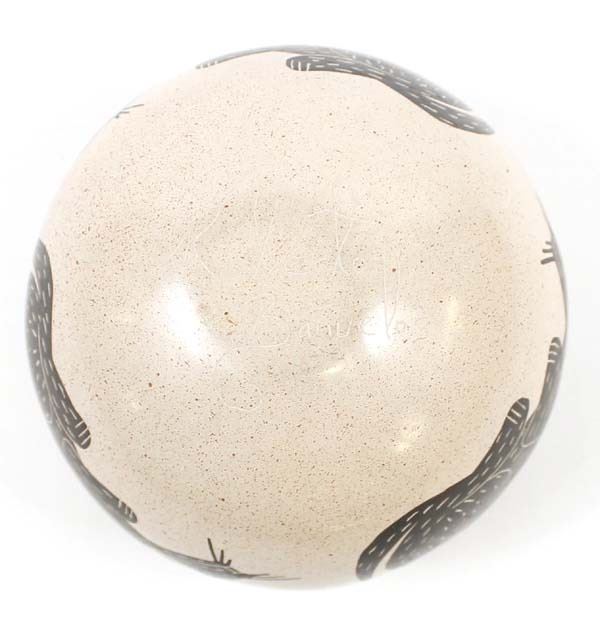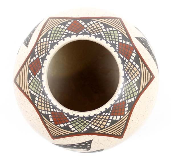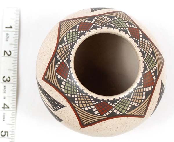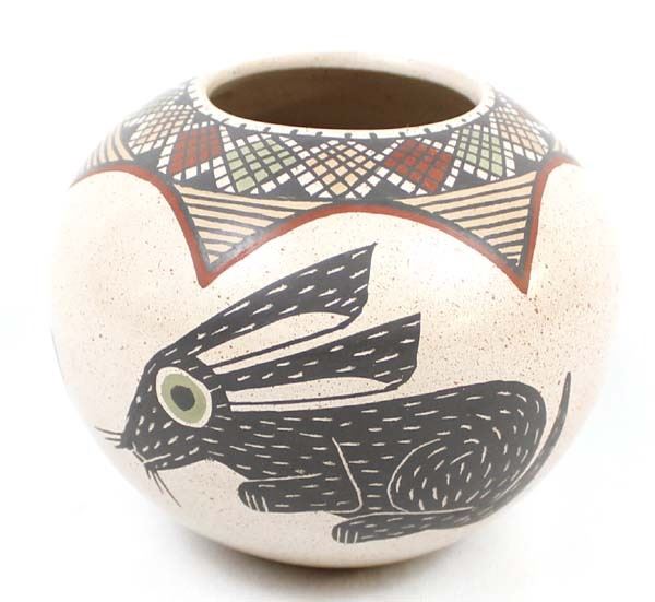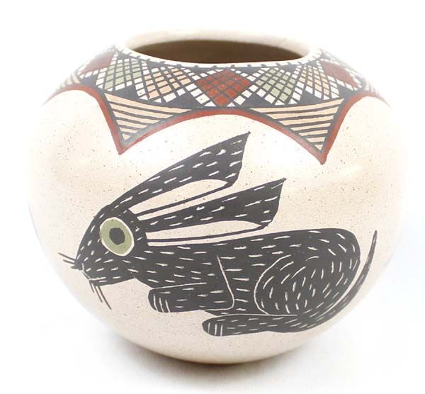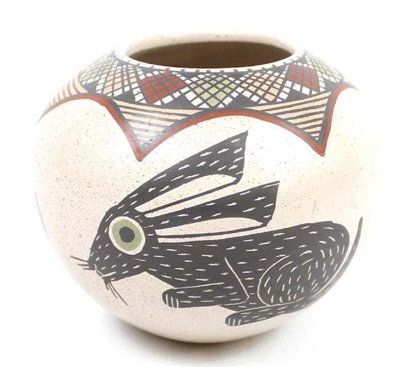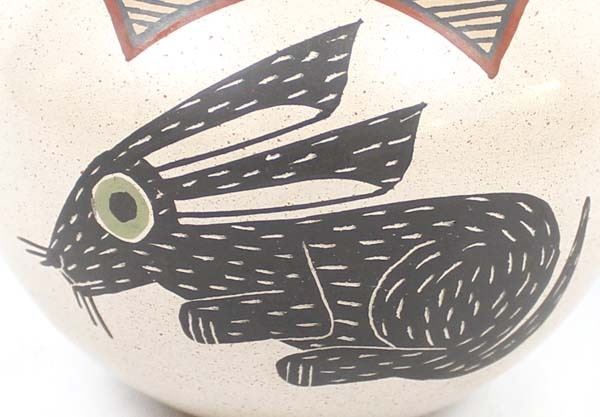 Mata Ortiz Polychrome Rabbit Bowl by Roberto Banuelos, measures 3.5''H x 4''D and is signed on the bottom, FYI: ''Roberto and Angela Ba¤uelos are a husband and wife team of potters from Mata Ortiz. She forms, sands and polishes their pots while he applies the designs. She uses black, yellow, red, white and mixed colors of clay that he then paints in multiple layers. He often begins by spattering drops of a particular color across the piece, then adding his interpretations of Mimbres designs: fish, rabbits, lizards, feathers and miscellaneous fantasy creatures. He is considered one of the top ten potters in Mata Ortiz. Roberto Banuelos is mentioned prominently in the authoritative book, The Many faces of Mata Ortiz, pages 85-87.''