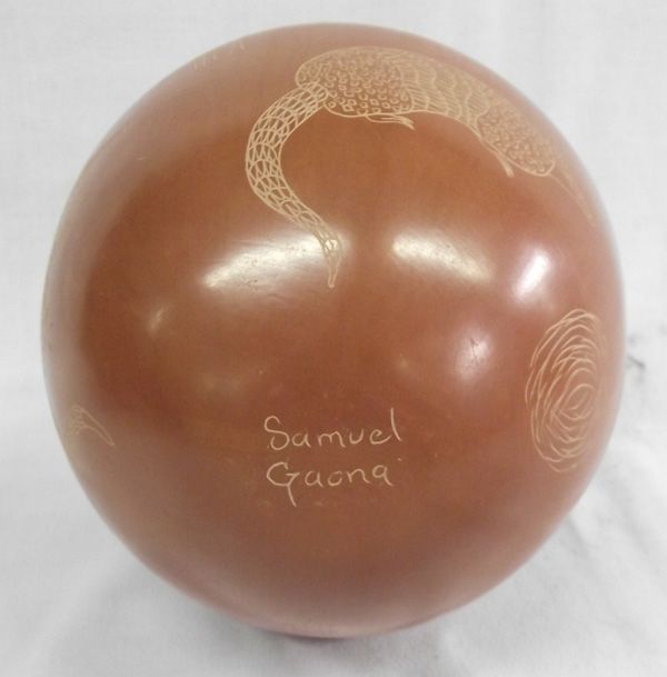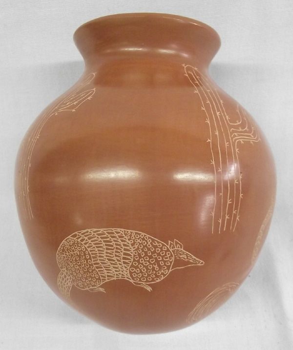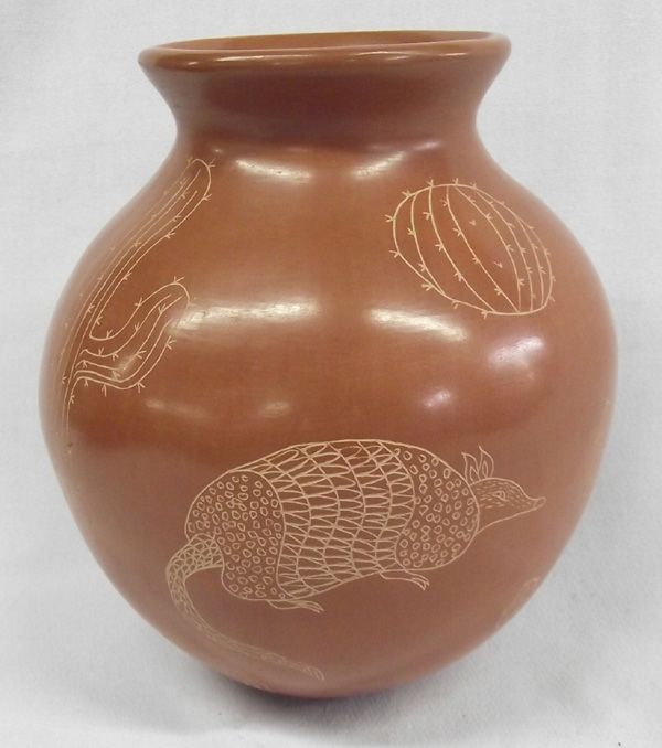 Mata Ortiz Sgraffito Armadillo Jar - Samuel Gaona, features etched armadillos, saguaro and barrel cactus on a mahogany background, pulled spout, measures 7''H x 6.25''W