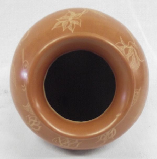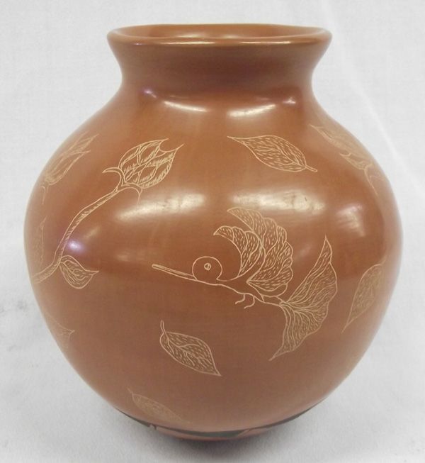 Mata Ortiz Sgraffito Flower Jar - Samuel Gaona, lovely sgraffito flowers and vines cover this jar on a mahogany background, measures 7''H x 6.25''W