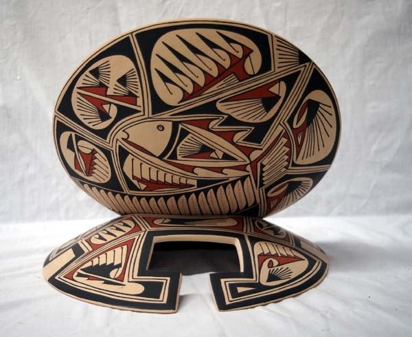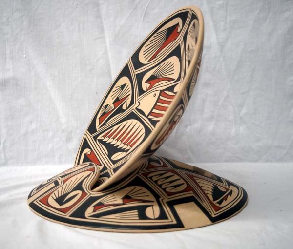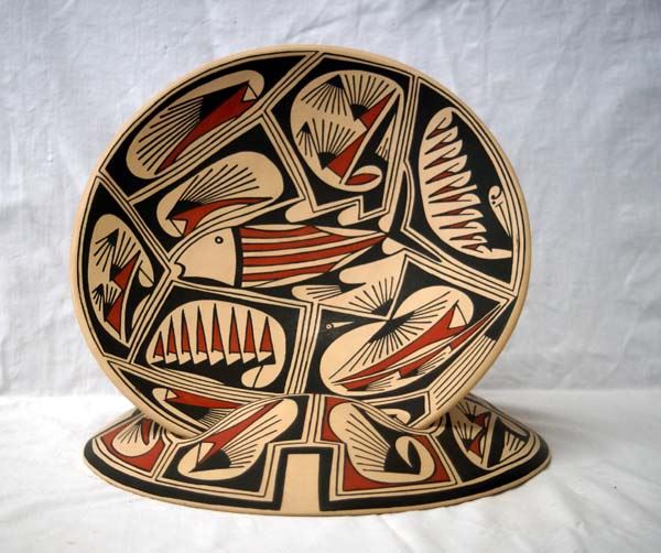 Mata Ortiz Polychrome Shallow Fish Bowl and Matching Stand by Efrain Lucero Andrew, Plate measures 9''D and stand measures 11''D, beautiful Paquime inspired designs, absolutely stunning work of art, signed on bottom by artist
