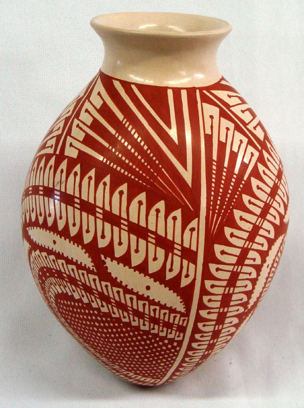 Mata Ortiz Small Jar Two Tone Red Cream. Exquisite football shape jar with swirls of geometric designs. It is either or unsigned or the signature is hidden. Measures 8''Hx5.5''W.