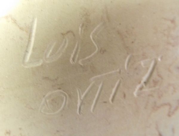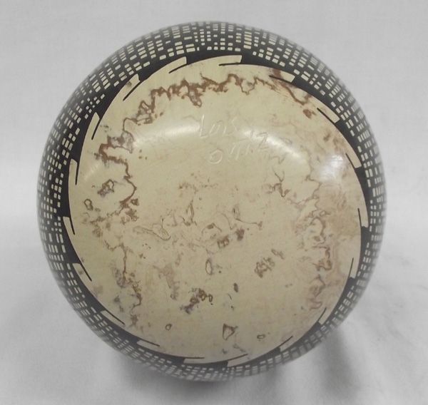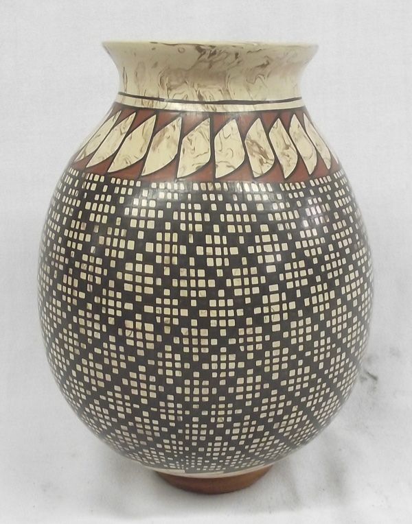Mata Ortiz Polychrome Stylized Feather Eye Dazzler Jar - Luis Ortiz, marbleized clay, black-cream-rust in color, black checkerboard designs, measures 8''H x 6.25W