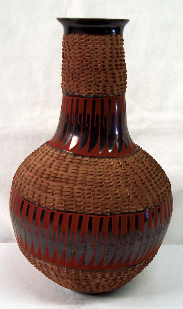 Mata Ortiz Tall Textured Jar - Lucie Zeta. Dark brown and black feather designs around the middle and neck of this tall jar. The texture is pushed pencil indentions. Signed on the bottom, Lucie Zeta. Measures 14''Hx8.5''W.