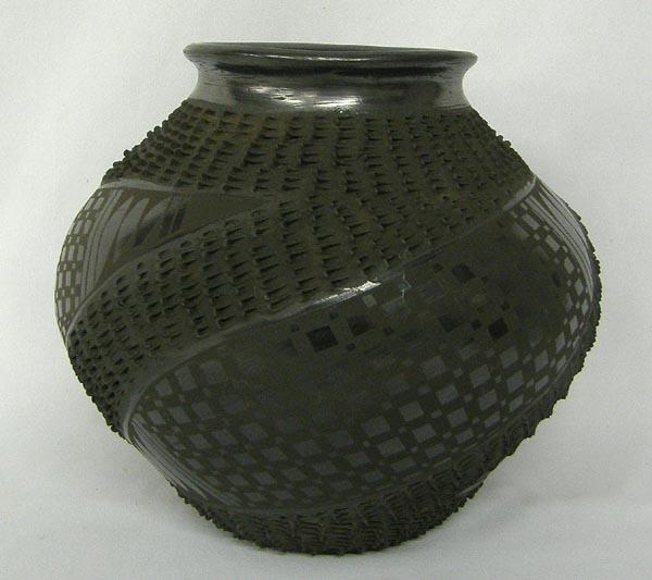 Mata Ortiz Textured Black Pottery by Mario Olivas. Measures 7''x8''. SHI $25.
