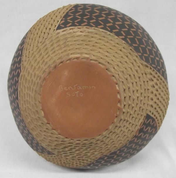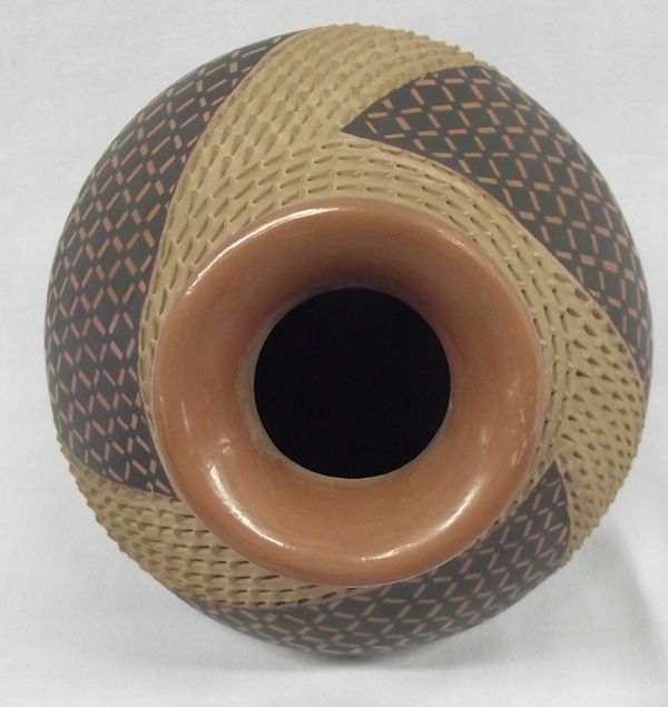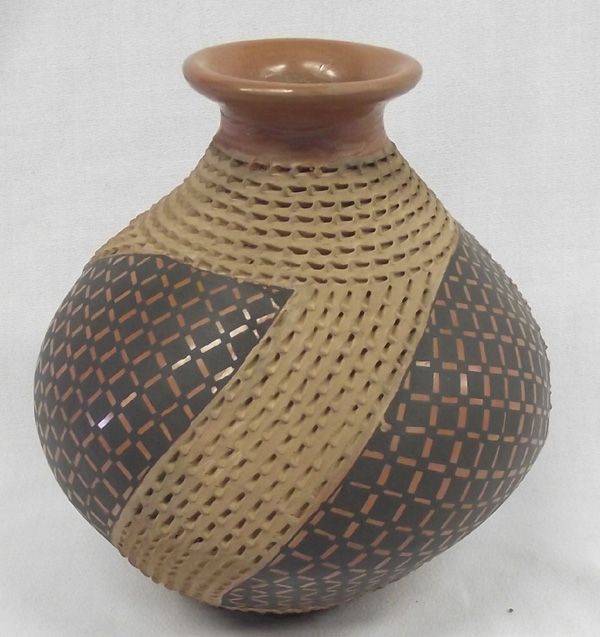 Mata Ortiz Textured Geometric Jar - Benjamin Soto, this beauty features a combination of texture and eyedazzling checkerboard designs, polychrome in colors of black-rust-light brown, highly burnished pulled spout, measures 7.5''H x 7''W