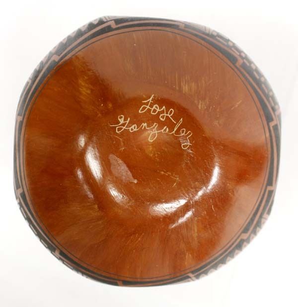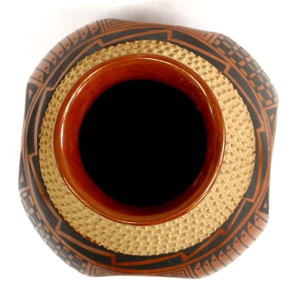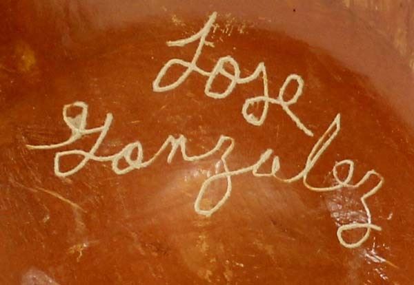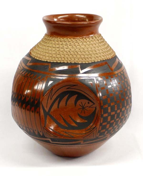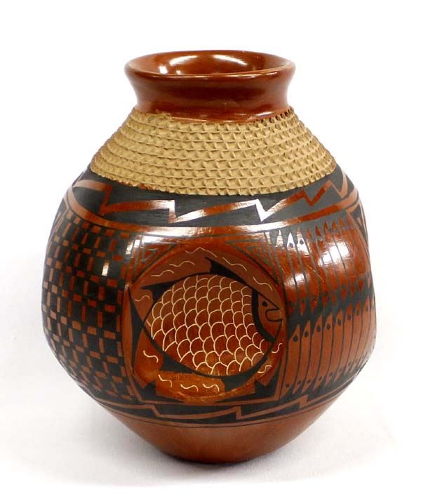 Mata Ortiz Textured Jar by Jose Gonzalez, measures 9'' x 10.5'' and signed on the bottom, textured neck and flared rim, features 4 concave medallions with fish designs