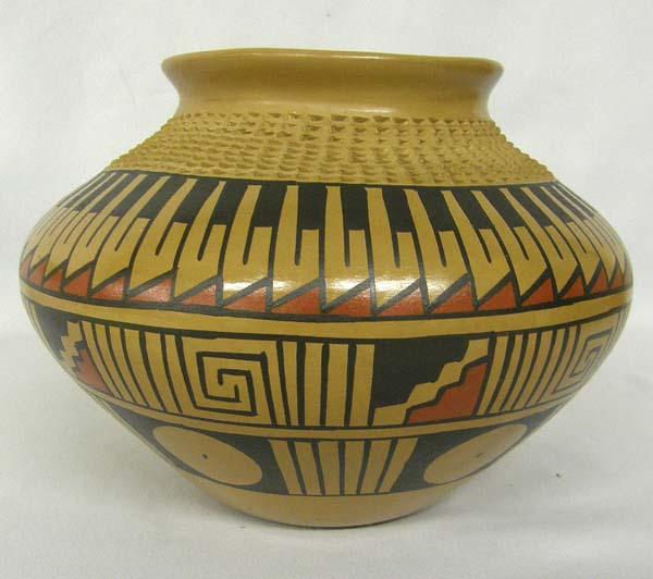 Mata Ortiz Textured Polychrome Pot by Jesus Tena. Measures approx. 6''Hx8''W. SHI $30.