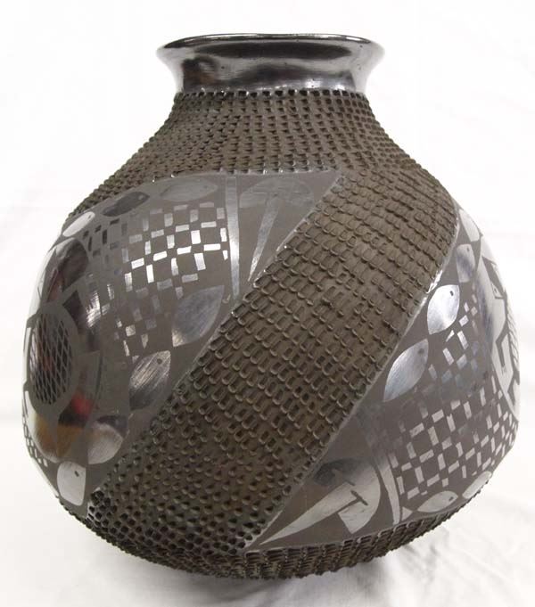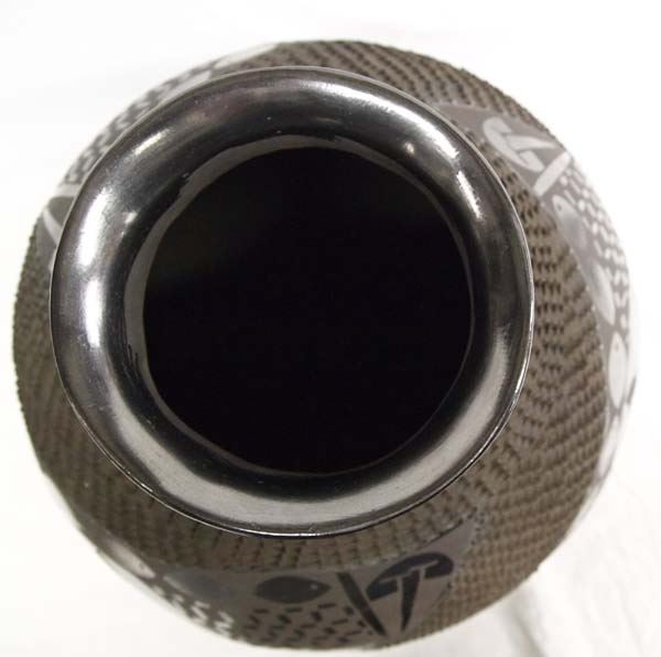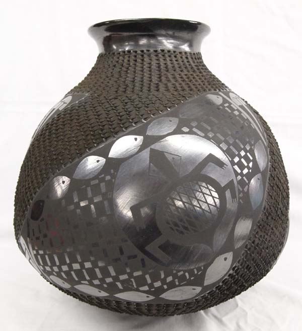 Large Mata Ortiz Textured Black on Black Turtle & Fish Jar by Graciela Sandoval, measures 13''H x 13''D, gun metal finish, phenomenal jar