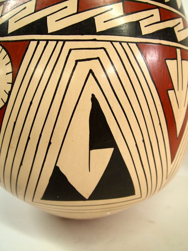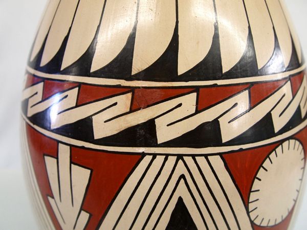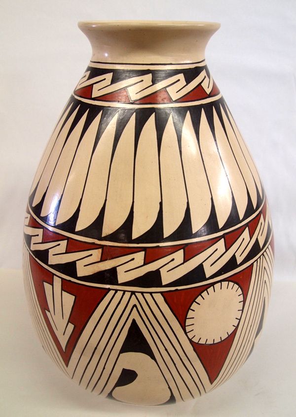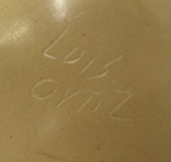 Mata Ortiz Very Large Polychrome Jar - L Ortiz. This tall jar has stylized feather designs around the upper portion and geometric designs below the midline. Signed on the bottom, Luis Ortiz. Measures 17''H x 11.5''W.