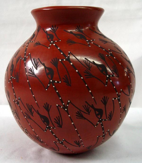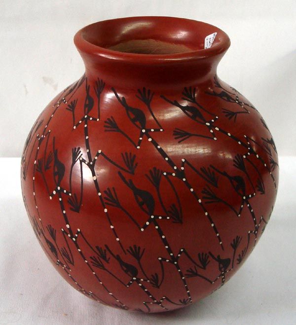 Mata Ortiz Water Bug Jar - Lucie Mora De Bugarini. Cute black water bugs with white dots crawling all over the reddish brown background of this jar that is signed on the bottom, ''Lucie Mora De Bugarini.'' Measures 6.5''Hx6''W.