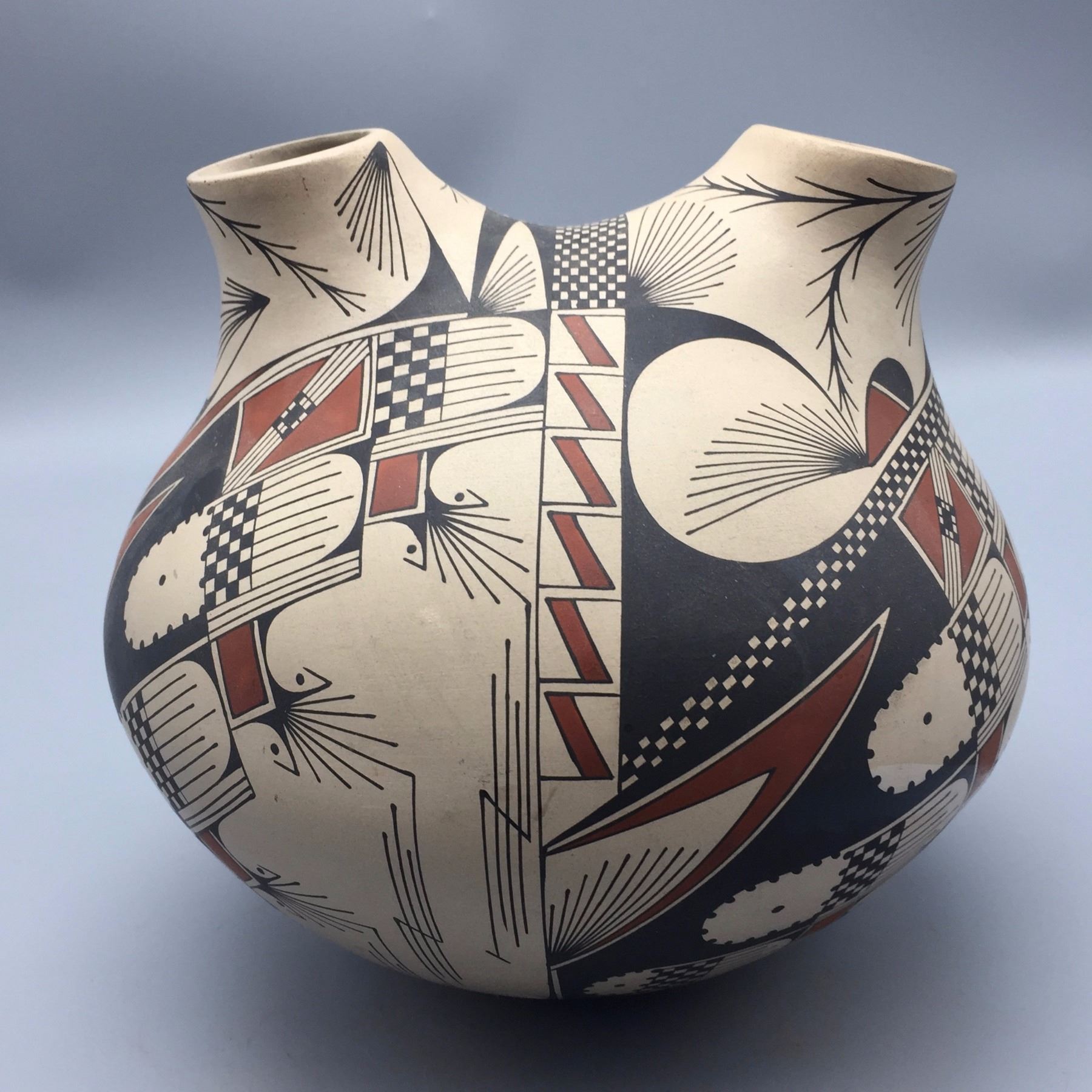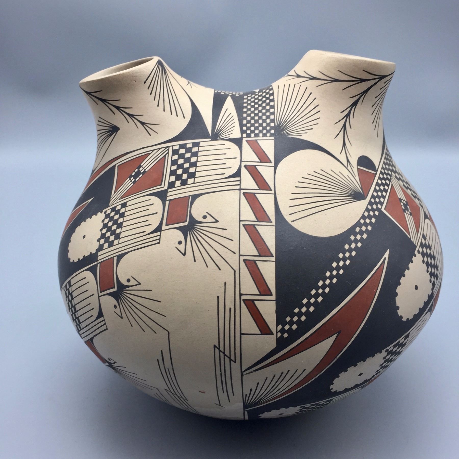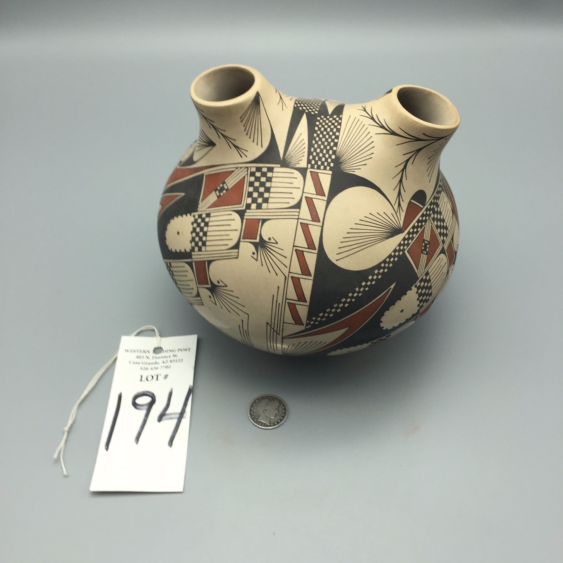 Maker: Lucy Martinez. Approx. Age: Fairly modern, NOS. Size: Measures 8” w x 6 3/4” h. Additional Info: Mata Ortiz wedding vase pot. Condition: Good, New, old stock (NOS) from dealer who is retiring. Please look closely at the pictures - they are an important part of our description. Shipping: There will be a $8 handling / packaging fee for shipping this lot. The actual cost of postage will be added on top of that.