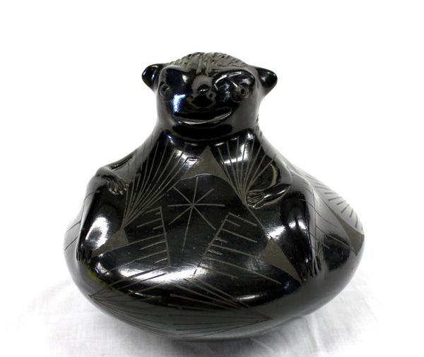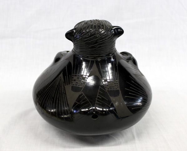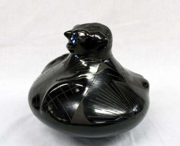 Mata Ortiz Zoomorphic Effigy Olla Ivon Quezada, measures 7'' x 8'' and features human face, badger head and ears, buttocks, and arms and legs, black on black, geometric and abstract accent designs, signed on bottom by artist