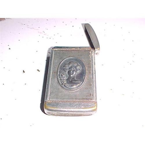 Match Safe for stick matches; (c) late 1800's; stricker on bottom flip cover; one side , raised embossed with Vict. ladies bust--back side Adv. Albert Muller Cafe; 321 17th Street; West, NY. JJ Removable adverftising; cond. Needs good cleaning and polishing. some silver wear on bottom showing brass base collecter piece ; useable