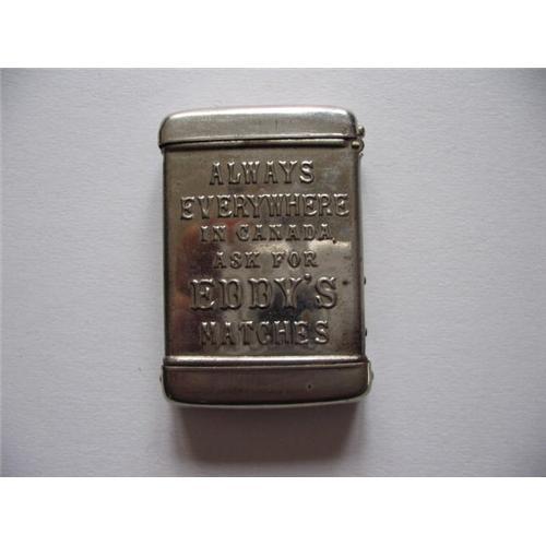 Has embossed name of company and inscription." Always Everywhere in Canada ask for Eddy's Matches".Theinscription On the obverse reads:"With the Compliments Of The E.B.Eddy Company Limited".A match safe made for a match company.