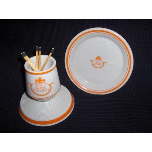 HERE IS A RARE FIND! RMS Queen Elizabeth match striker and a small round tray for spent matches. Made of white china with orange details of the royal seal and name. This came from the Cunard Line (sister ship of the Queen Mary) RMS Queen Elizabeth. You won't see this piece become available very often. The condition is excellent. No cracks, chips or paint loss. The small round tray still has the gold paper seal with the large "E". The bottem of both pieces has "Premere Class 1978" in orange. See photos. Have a glance at my other items. Thank you for viewing.