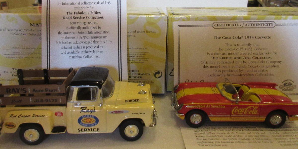 The Fabulous Fifties scale Road Service Collection, Ray's Service Chevrolet Pickup, with Certificate MIB, The Coca-Cola Matchbox Cruisin With Coke 1953 Chevrolet Corvette, 1998 produced