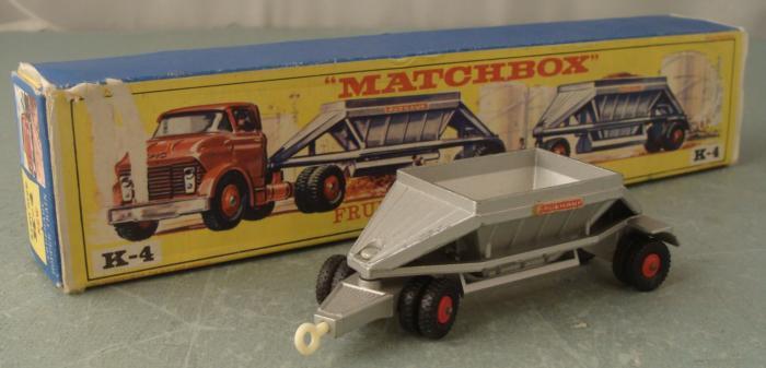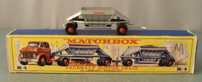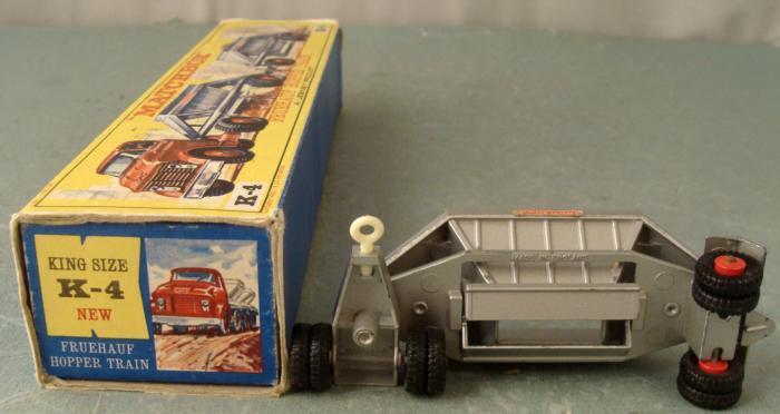 This is a partial Matchbox King Size model K-4 Fruehauf Hopper Train, issued in 1967. Included is one car, no cab, but if you do have the full version you can add this car to it to extend your vehicle. It is in excellent condition, with minor paint wear. It comes in the original box, which is in very good condition, with some marker writing near one edge, and spots of surface wear. The graphics still look bright. The hopper on the car opens at the bottom. The box is a slide-out type, not the cellophane as is commonly seen. * This will make a nice addition to your Fruehauf Hopper.