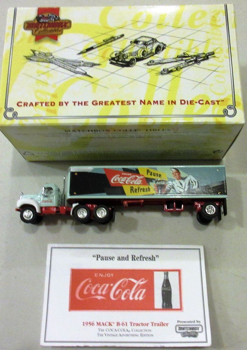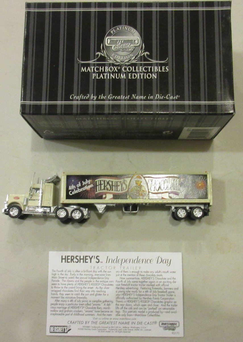3 Die Cast Semi With Trailers made by Matchbox; Hershey 92169 "To Motor Hershey's Kisses"; Hershey 92171, "Fourth of July Celebrations; Coca Cola "Pause -refresh " Dym Dinky