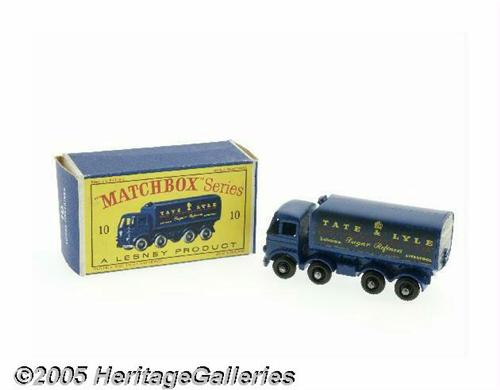 <B>Matchbox Series: Tate and Lyle Sugar Refiners with Box (Lesney, 1960).</B></I> Matchbox collectors are legendary for their zeal and devotion to their hobby -- and will recognize the scarcity of this piece. Offered here is a lovely Matchbox offering. Produced by Lesney in England, this is a nifty Tate & Lyle Sugar Refiners Truck. With original vivid blue colors, the overall condition is exceptional. There is just a tad of wear along top edge of back of truck. Box (stating "10 Sugar Container" on each flap) is complete with no fading; sharp box. Great addition to your collection! <I>From the Larry Jacobs Collection.</B></I>