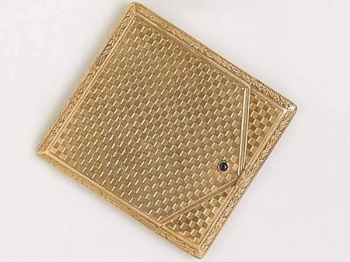 14 K gold, angular envelope form, hinged cover, chequered guilloche decoration on the surface, circa 1930, import mark, weight 38.4 g.