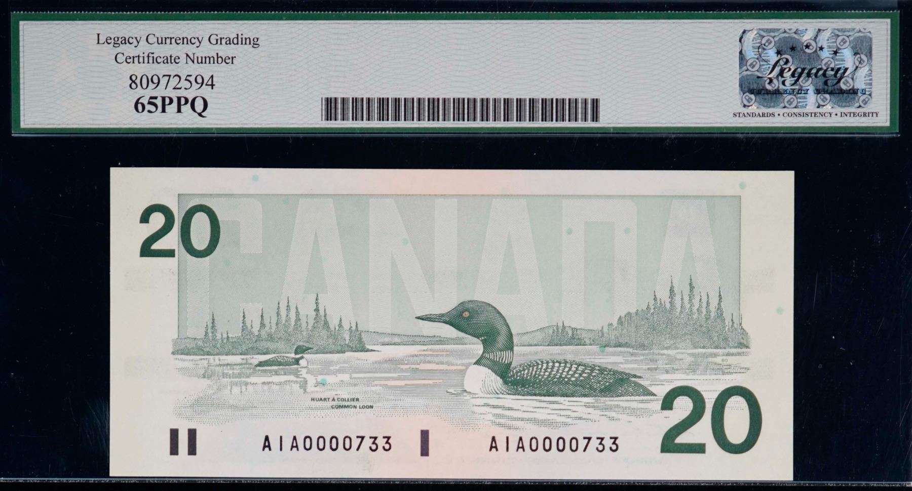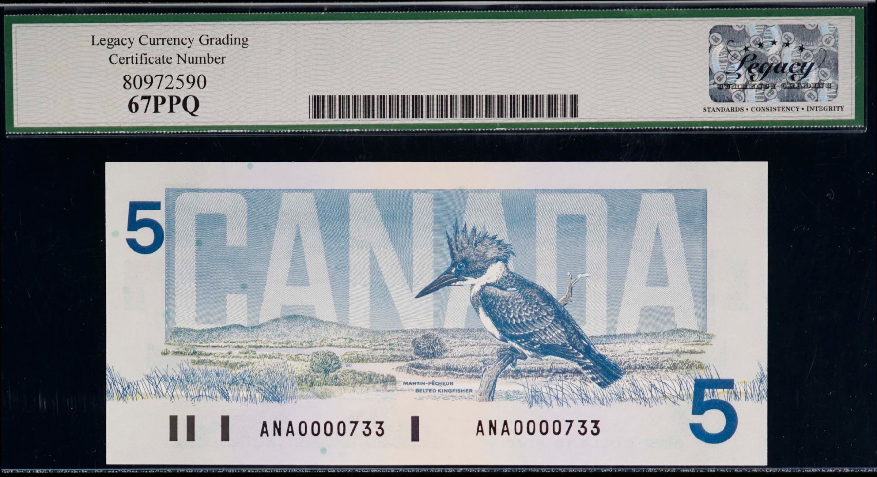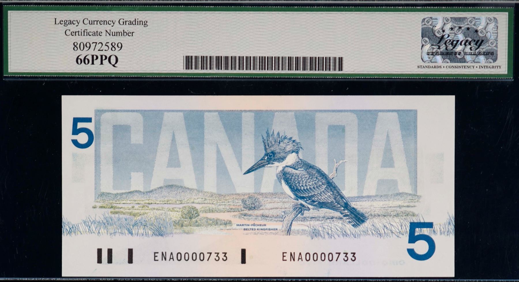 Matched Low Serial Numbered Set; Bird series 1986-1991 $5 to $100 - 7 note set! #0000733, all Legacy graded Choice Uncirculated-64 to Superb Gem Uncirculated-67PPQ.- Very attractive and desirable "Low number matching Set" seldom seen and offered.
