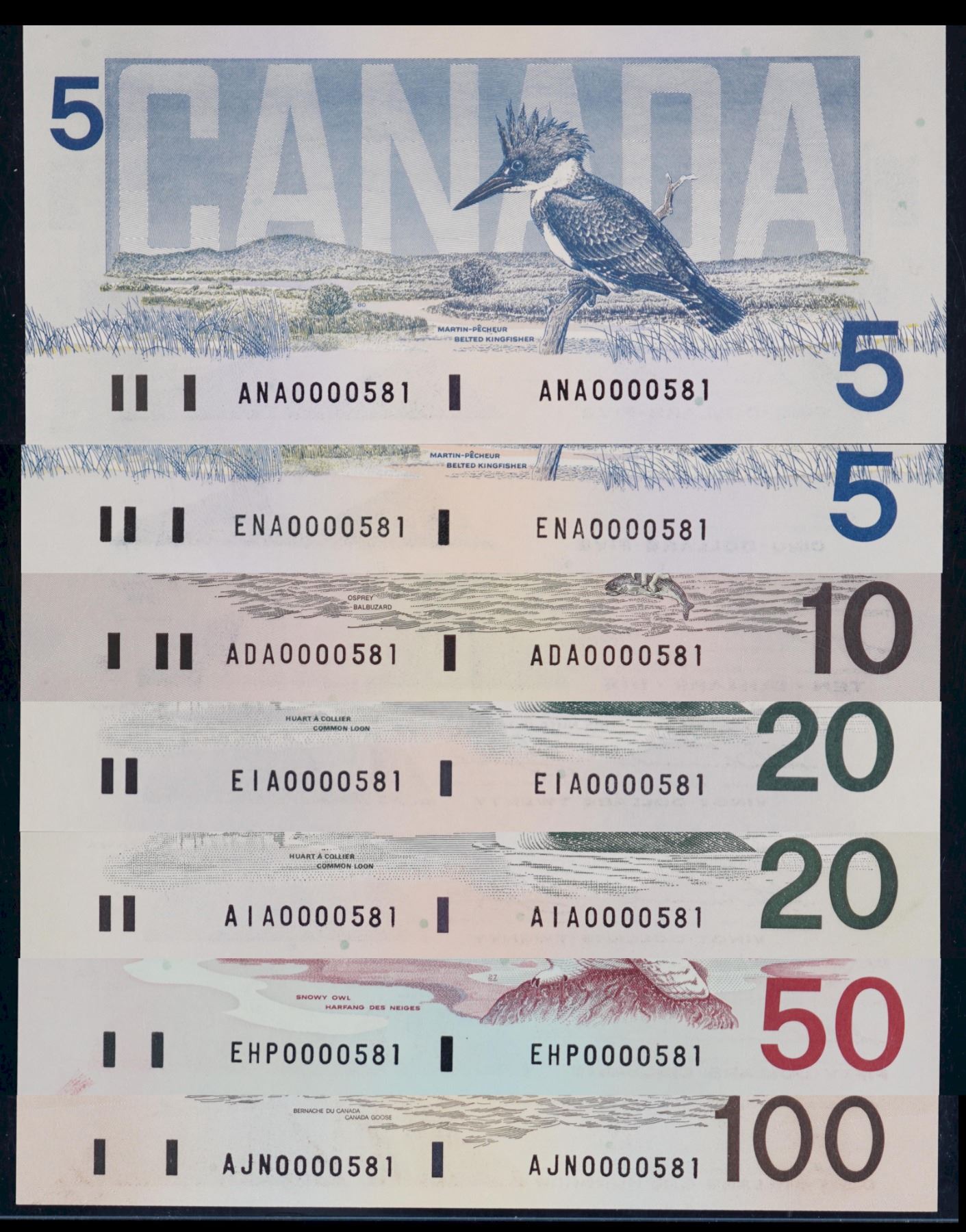 Matched Low Serial Numbered Set; Bird series 1986-1991 $5 to $100 - 7 note set! #0000851, all PCGS graded Choice Uncirculated-64 to Superb Gem Uncirculated-67PPQ.- Very attractive and desirable "Low number matching Set" seldom seen and offered.
