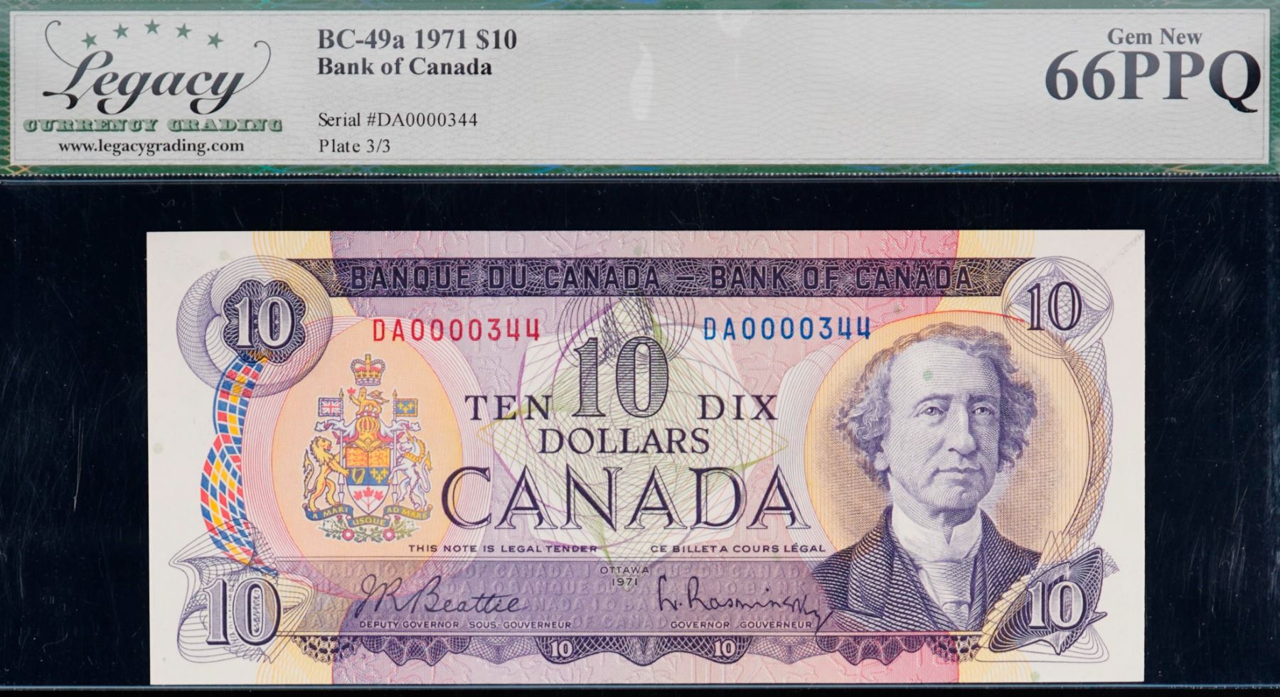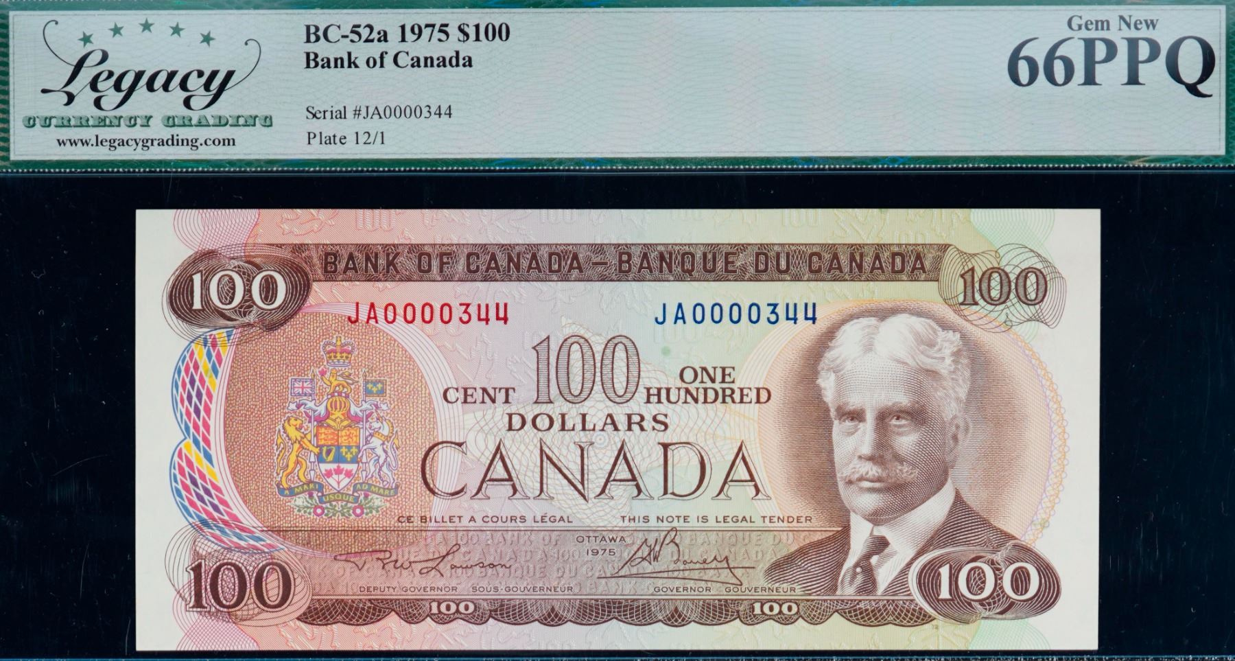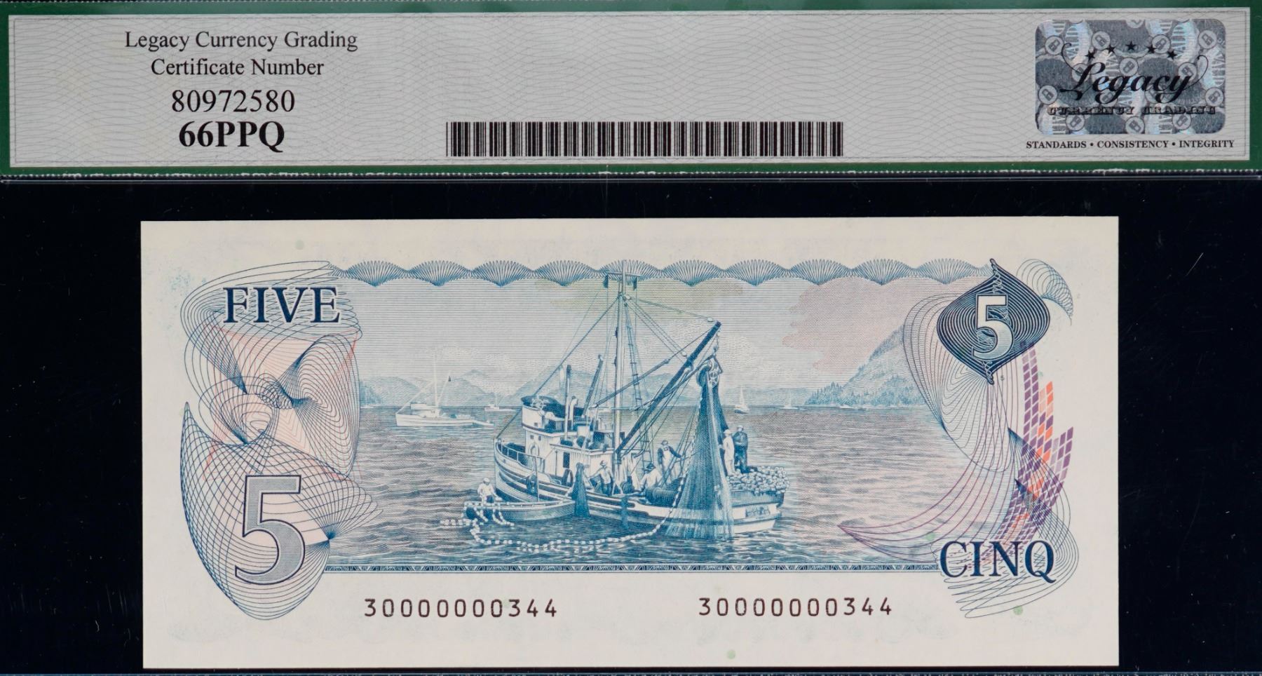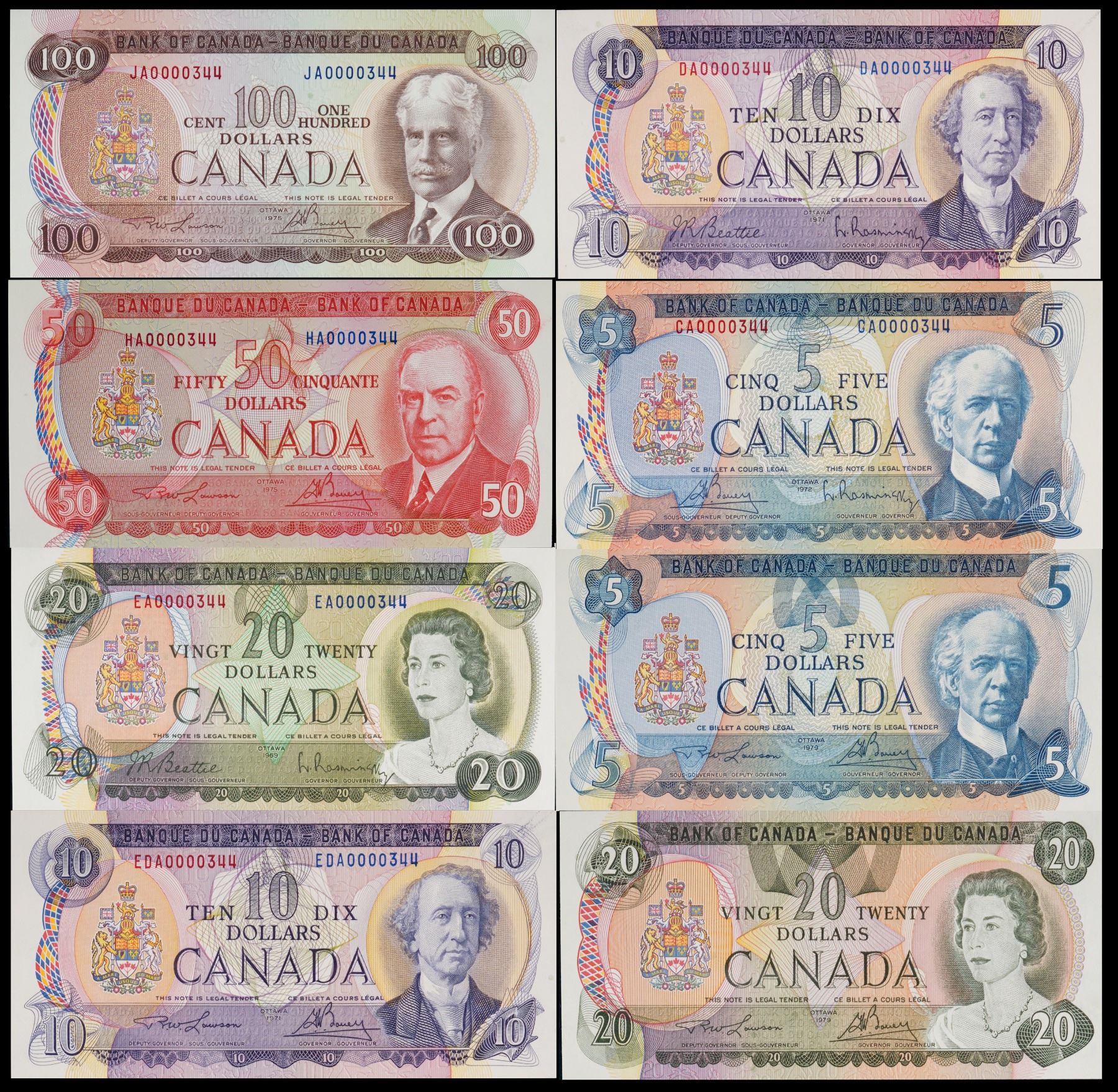 Matched Low Serial Numbered Set; Multi-colour series 1969-1979 - 8 note set! $5 to $100 #0000344, all Legacy graded Choice Uncirculated-64 to Superb Gem Uncirculated-66PPQ. Very attractive and desirable "Low number matching Set" seldom seen and offered.