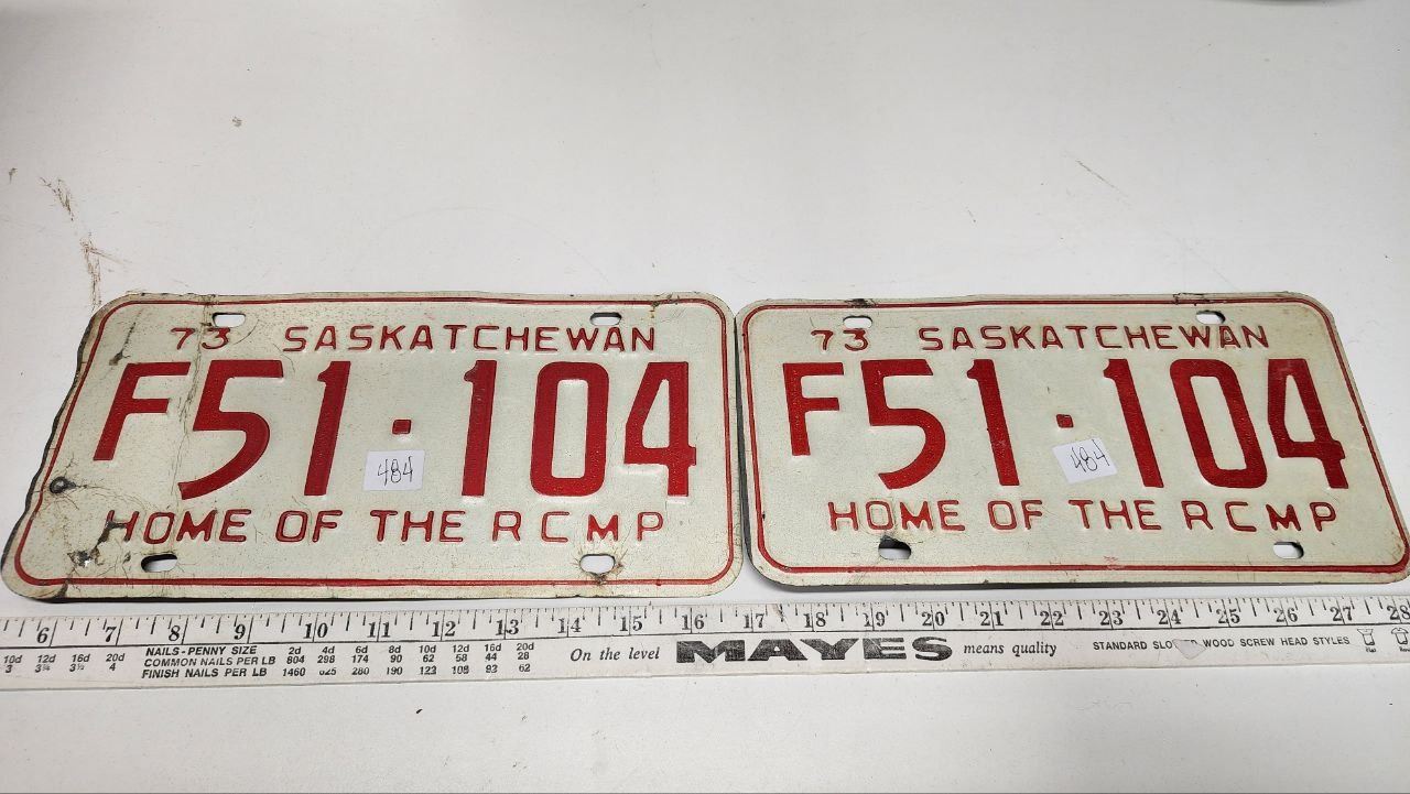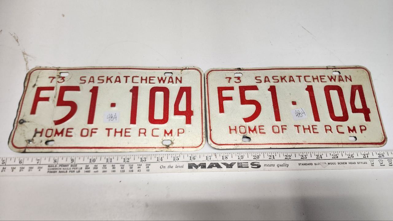 Matched Pair of 1973, Sask Farm License plates "Home of the R.C.M.P."