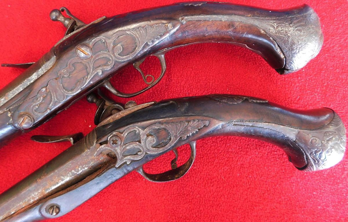 Matched Pair of Dueling Pistols, circa 1700s. Made of steel, wood, brass and gold, the items measure 20.5" x 5" x 3" each. Indo-Persian. Probably French inspired; scrollwork on wood and steel w/some gold inlay. Very fancy brasswork. Condition: Some minor damage, one pistol gives in the center where the wood has been cracked, see images. Shipping: $65.00 USA estimate only includes insurance, signature and double-box.