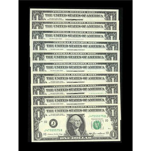 <B>Matched Serial Number $1 Green Seals.</B></I><BR>Two sets Fr.1900-I & Fr. 1901-D Serial Number 4964, Fr. 1900-I & Fr. 1901-C Serial Number 4993<B>Ch-Gem CU.</B></I><BR>Fr. 1910-F & Fr. 1912-J Serial Number 7654 <B>Gem CU.</B></I><BR>Two Sets Fr.1913-I, J Serial Number 47555475 & Serial Number 47555575 <B>Gem CU.</B></I><BR>