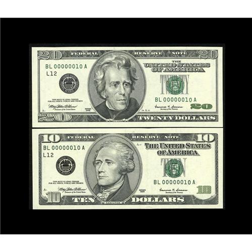 <B>Matched Serial Number 10 Green Seals</B></I><BR>This lot consists of an Fr. 2034-L and an Fr. 2086-L. The $10 sports a small amount of handling while the $20 is as clean as the day it was printed. <B>Choice Crisp Uncirculated.</B></I><BR>
