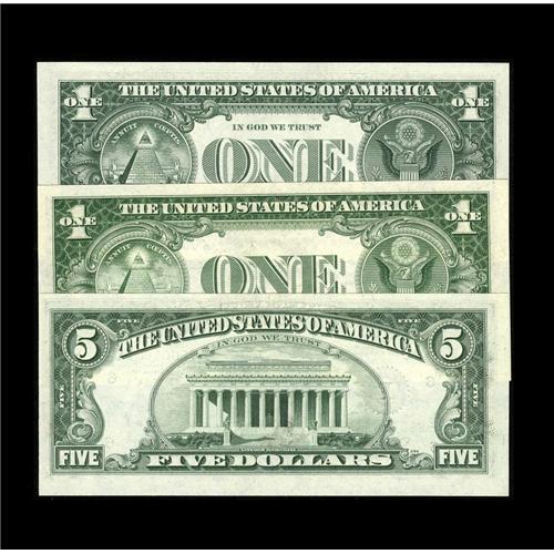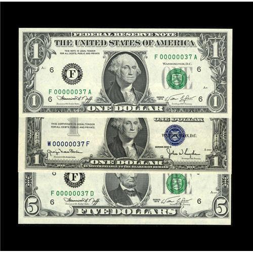 <B>Matched Serial Number 37 Trio.</B></I><BR>The notes which comprise this intriguing lot is a matched trio of serial number 37 notes. Fr. 1613W 1935D $1 Silver Certificate, Fr. 1908-F 1974 $1 Federal Reserve Note, Fr. 1973-F 1974 $5 Federal Reserve Note. All of them all well embossed with nice margins.