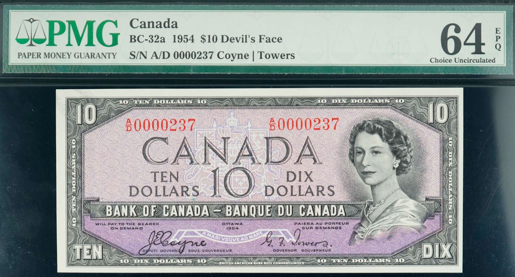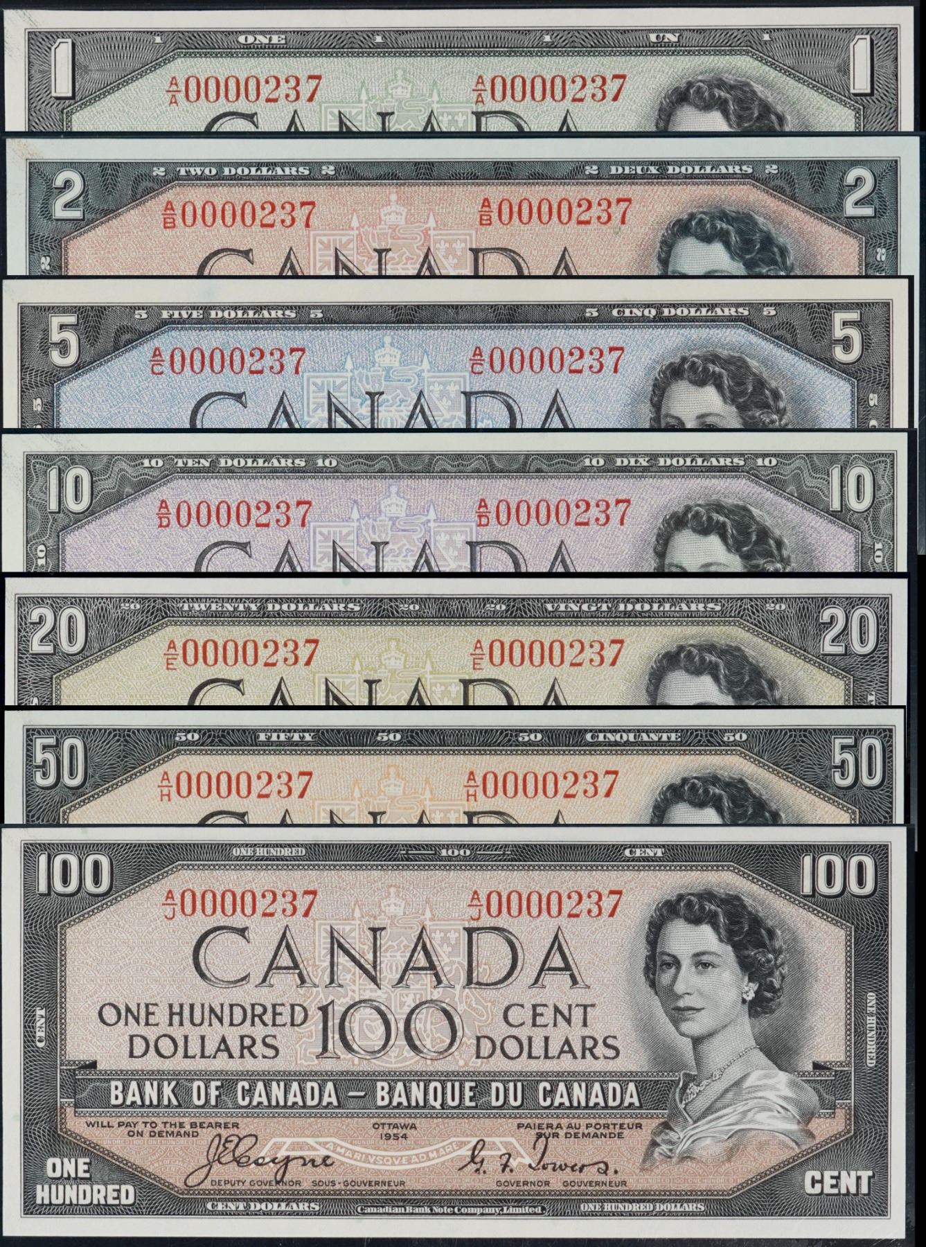 Matched Serial Numbered Set; 1954 Devil's Face $1 to $100 #0000327, all PMG graded 64EPQ w/exceptions $1 Choice About Uncirculated-58 & $2 Superb Gem Uncirculated-66 both with EPQ designations. Very attractive and desirable "Low number matching Set" seldom seen and offered.