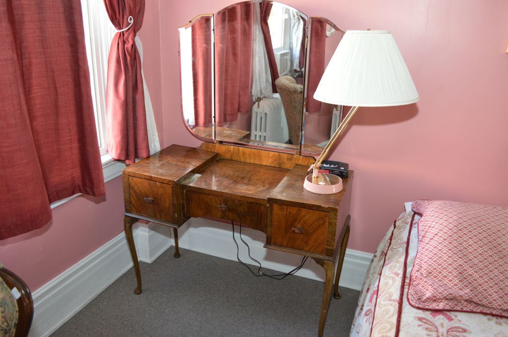 Matched grain walnut three drawer triple mirror vanity on tall cabriole feet with original bakelite pulls