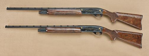 Matched pair of Remington model 1100 semi-automatic shotguns in 28ga and 410ga. Skeet choked, ventilated ribs, finely engraved and gold inlaid with select checkered burl walnut stock, matched pair #3729 on forward left side of frame and serial #L159604J and L151396H. The pair remain in fine to excellent condition showing 99% plus refinish at time of engraving. Excellent stocks. No evidence of firing or use, just slight handling. A beautiful small bore set with quality engraving and gold inlay. From the Robert Petersen estate. Est: $3,000 - $6,000