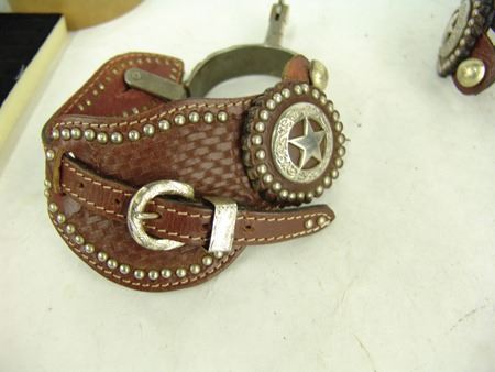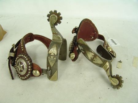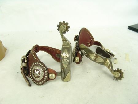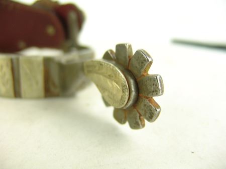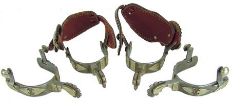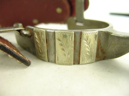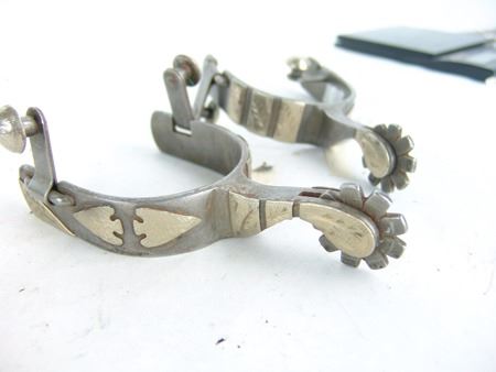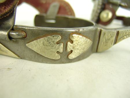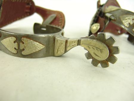 Md 1900s, Vintage pair of men's steel roper spurs with hand-hammered arrowheads and engraved panels all of Mexican silver and overlaid, and with 1-1/4", 9pt, blunt-tipped rowels, one pair with straps. Very good condition. Larger 9"