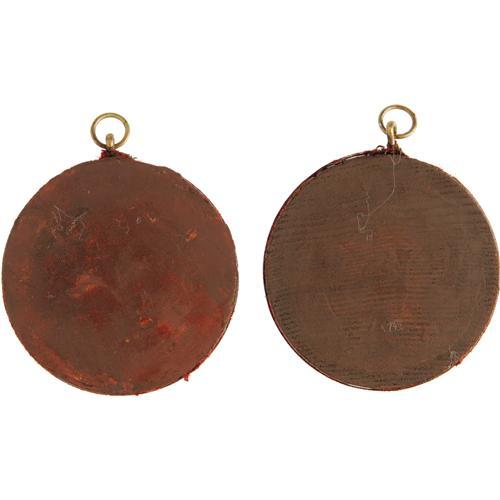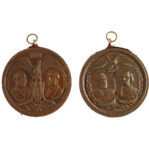 <B>Matching Blaine and Cleveland Wooden Medals</B></I> in near mint condition. Measuring 3" in diameter, these wooden medals are struck with the clarity of hard medals, enhancing every detail with the wood finish. Here we have a nice pair representative of the 1884 campaign between James G. Blaine and running mate John Logan and Grover Cleveland and his running mate Thomas Hendricks. You would find it hard to mate two finer examples of this election.