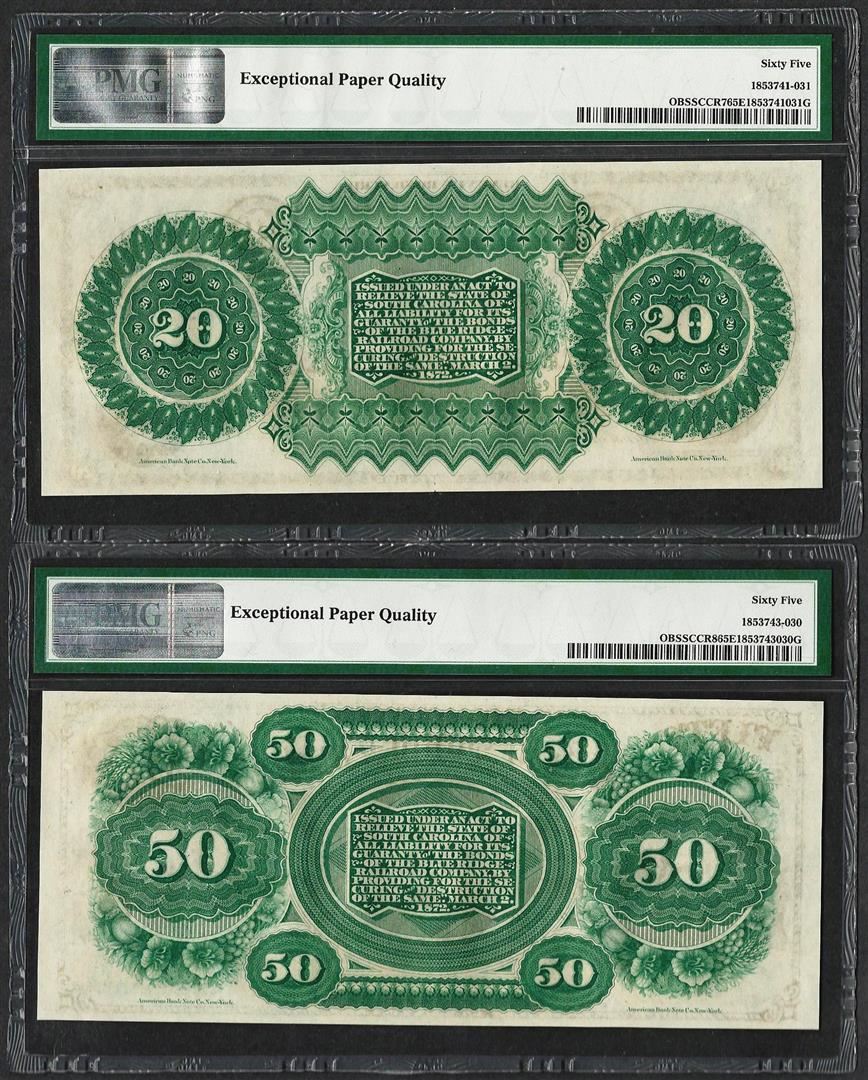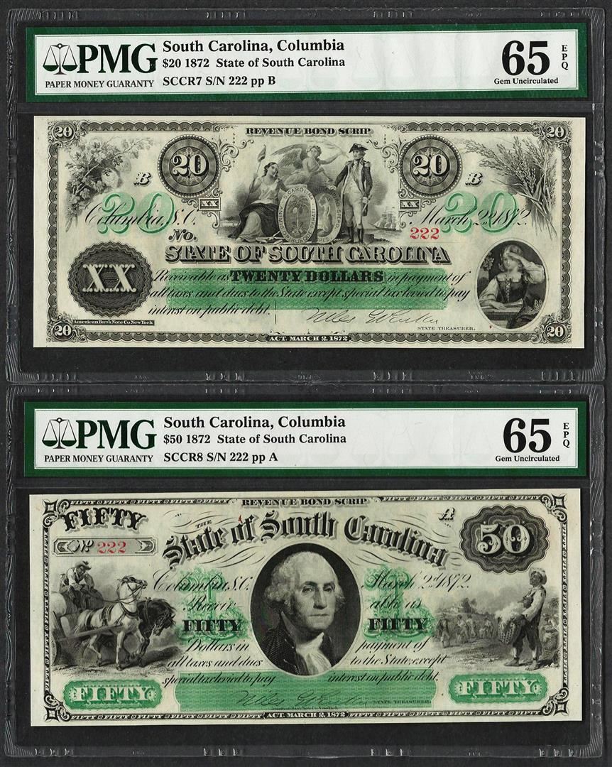 One Matching Fancy Serial 1872 $20 & $50 South Carolina Obsolete Notes PMG Gem Unc. 65EPQ. PMG Certified.
