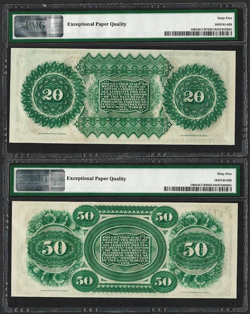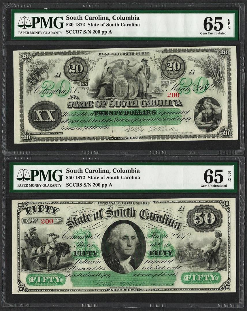Matching Low Serial 1872 $20 & $50 South Carolina Obsolete Notes PMG Gem Unc. 65