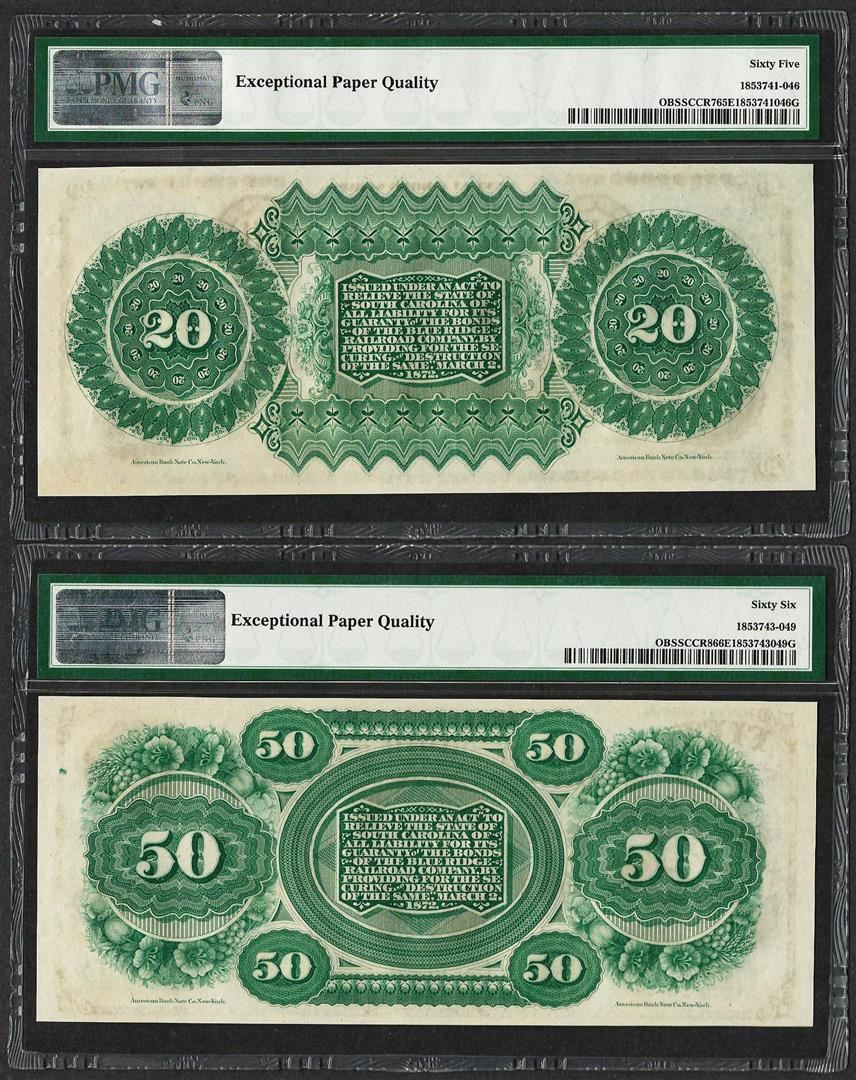 Matching Low Serial 1872 $20 & $50 South Carolina Obsolete Notes PMG Gem Unc. 65