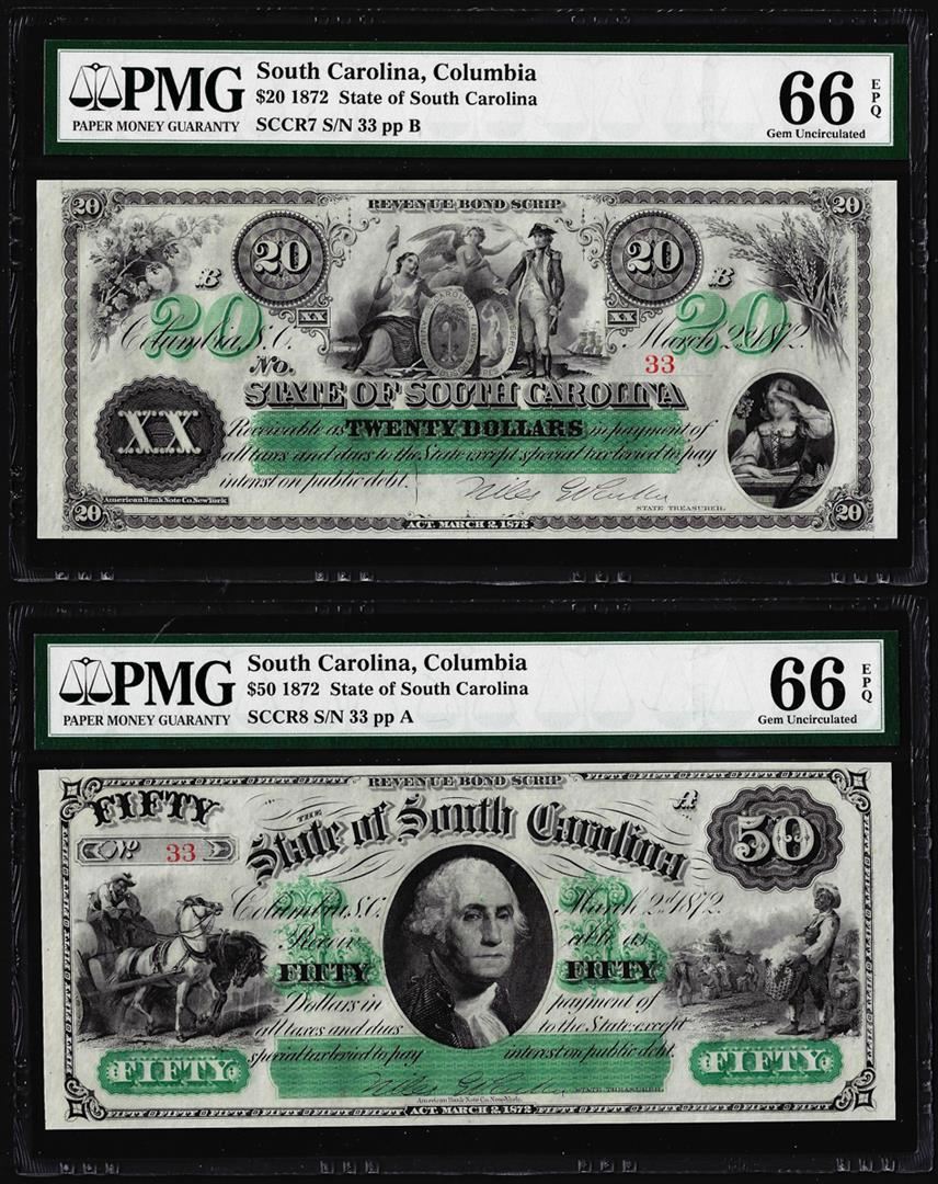Matching Low Serial 1872 $20 & $50 South Carolina Obsolete Notes PMG Gem Unc. 66EPQ