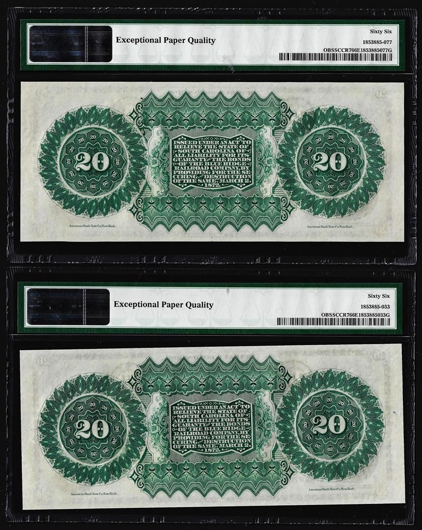 One Matching Low Serial 1872 $20 South Carolina Obsolete Notes PMG Gem Uncirculated 66EPQ. PMG Certified.